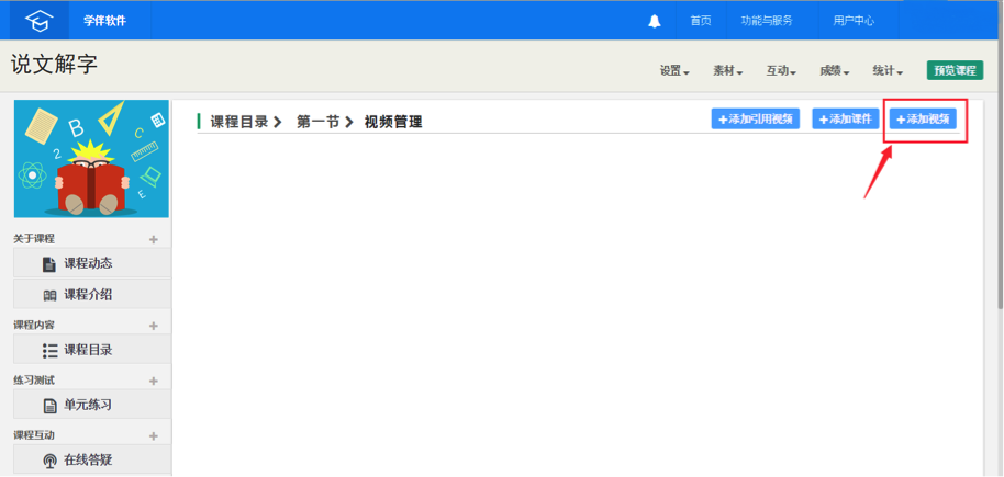 1)在【课程目录】界面,点页面右上方的【素材】,进入【视频库】。