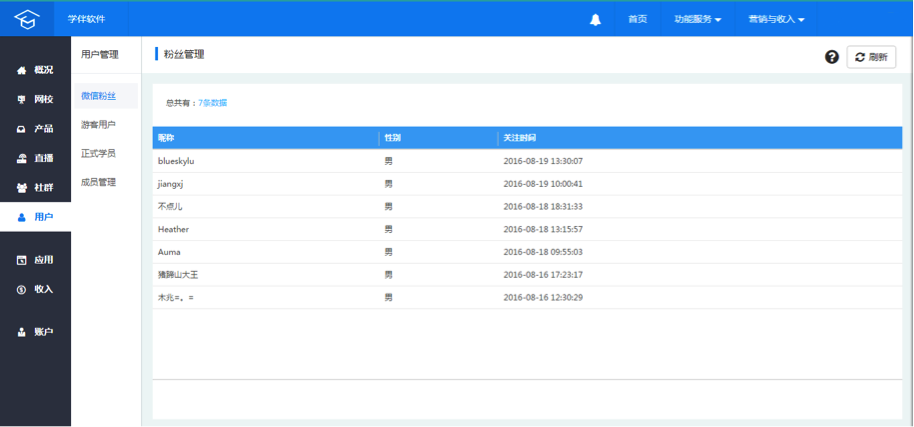 在【用户】菜单栏下,进入【微信粉丝】子菜单,可以看到【粉丝管理】列表中罗列了所有关注了微网校公众号的客户信息,包括昵称、性别和关注时间。